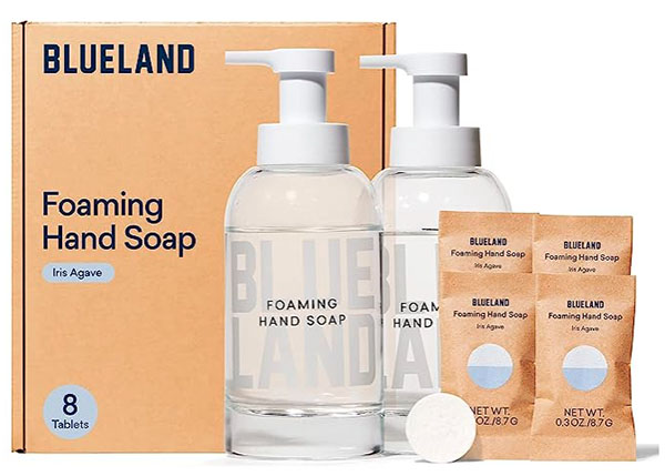 BLUELAND Hand Soap Duo – 2 Refillable Glass Foaming Hand Soap Dispensers + 8 Tablet Refills | Iris Agave Scent | Makes 8 x 9 Fl oz bottles (72 Fl oz total)