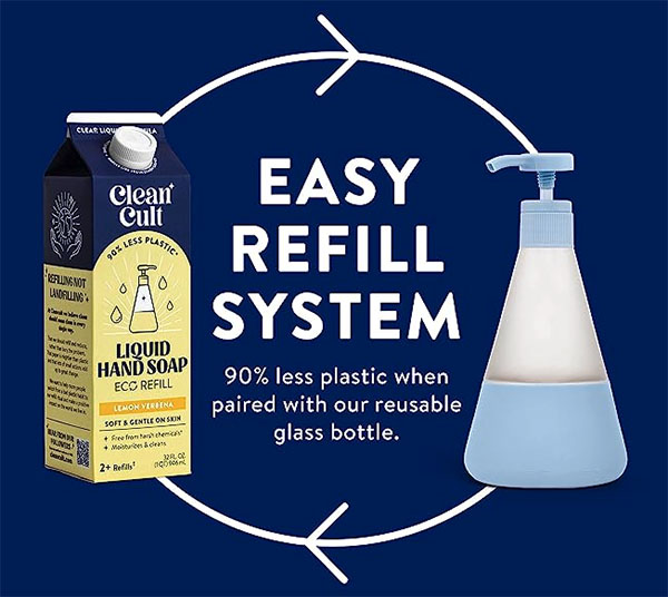 Cleancult Liquid Hand Soap Refills (32oz, 1 Pack) – Hand Soap that Nourishes & Moisturizes – Liquid Soap Free of Harsh Chemicals – Paper Based Eco Refill, Uses 90% Less Plastic – Lemon Verbena. Refill your hand soap containers with this liquid soap delivered in a mostly-paper package.