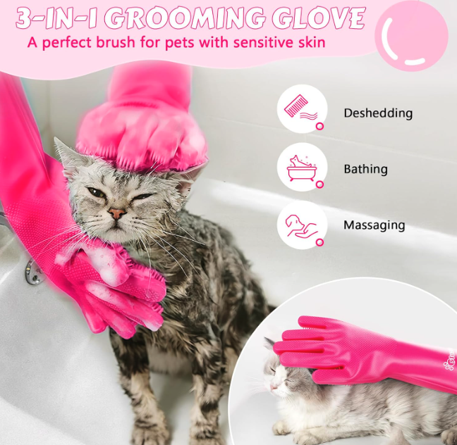 Pecute Pet Grooming Gloves, Heat Resistant Cat Bathing Gloves with High-Density Teeth, Silicone Dog Bathing Gloves with Enhanced Five Finger Design, Bathing and Massaging for Dogs and Cats Pink