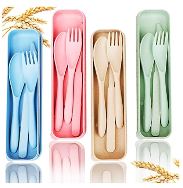 Reusable Travel Utensils Set with Case, 4 Sets Wheat Straw Portable Knife Fork Spoons Tableware, Eco-Friendly BPA Free Cutlery for Kids Adults Travel Picnic Camping Utensils(Green, Beige, Pink, Blue)